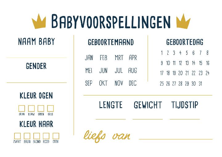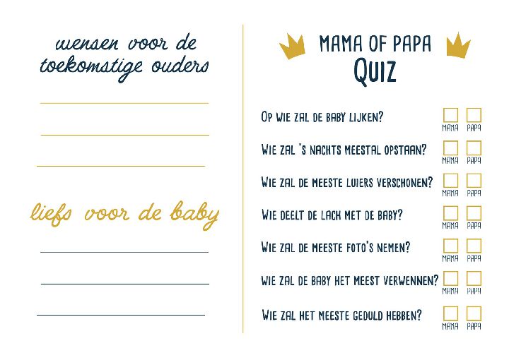 | Extra specificaties: | Wenskaarten om de naam, geslacht en geboortedatum van het kindje te raden. Op de achterzijde ook ruimte voor wensen aan de ouders en een kleine mama of papa quiz. |