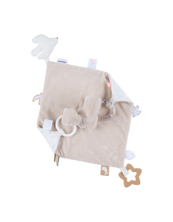 | Inhoud: | activiteiten knuffeldoek met een rammelaar, een spiegel, een bijtspeeltje, knisperpapier en speelse labeltjes |