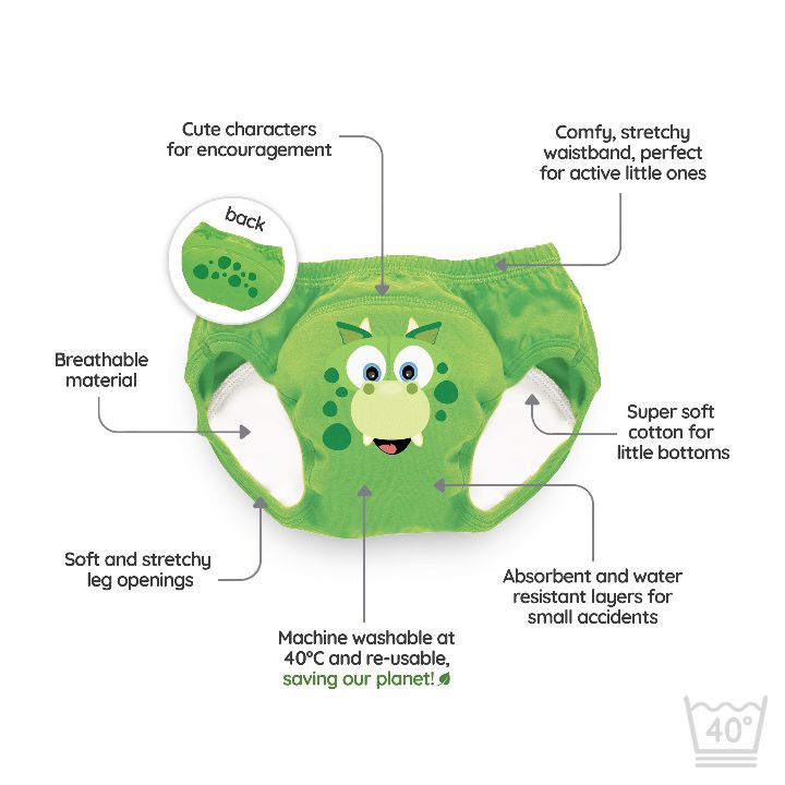 De rekbare oefenbroekjes zijn ontworpen om eenvoudig aan en uit te trekken, net als een onderbroek. Dankzij de elastische stof kan je kind ze zelf dragen, wat de training vergemakkelijkt. Bovendien zijn deze broekjes wasbaar in de machine, wat niet alleen kosten bespaart op wegwerpluiers, maar ook beter is voor het milieu.